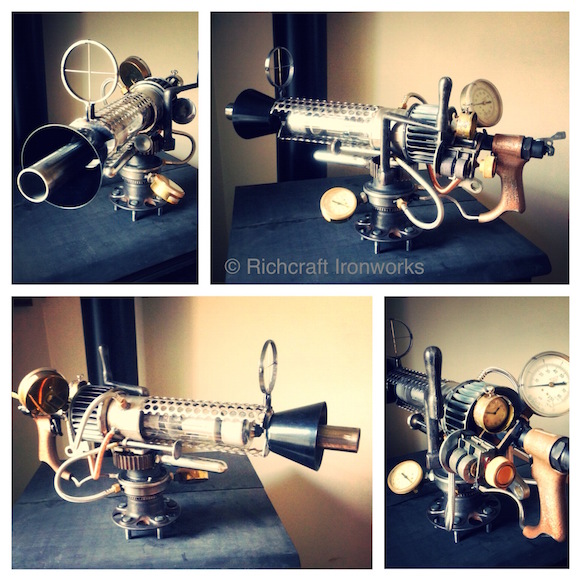 These works, at times “Steampunkish,” allow me to use a different side of my brain. It’s like a puzzle to me. My wife and I enjoy spending time at auctions and junk yards, and it’s there that we find those unique and interesting components that inspire and become, well, anything. It usually starts with one certain piece. From that I’ll add to it, sometimes taking weeks, even months, to complete a vision. Usually, the hardest part is to know when it’s done, since the subject matter that I’m putting together is quite often fictitious. Making these type of works gives my mind and my hands a bit of a break. They aren’t very labour intensive on my hands; no cutting or pounding is usually required. I love ‘em.