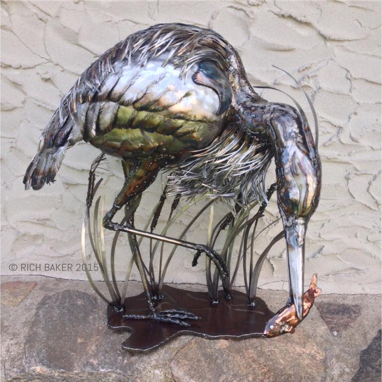 I am a very visual person. Each time I see something that captures my attention, the first thing that’s going through my mind is,”how can I make that.” Usually, I’ll toss the idea around in my head for a while. Then I’ll tack up as many pictures as I can of the subject in my shop, surrounding myself with the creature, living with it for a bit. Pictures work best in lieu of bringing the actual animal into my shop… I don’t believe they’d sit still long enough. I’ve discovered that I have the ability to look at a subject and figure out the anatomy. Where this ability comes from, is part of the magic of what I do. I don’t mean to sound evasive or vague about the process, but I just start cutting metal. As I’ve often explained, it’s as if my eyes are just watching (front row seat if you will) what my hands are doing, and it comes together. For each piece of the subject, I hand cut, hammer into the shape and then weld in place. I usually start with the nose (or beak) of the creature to get the proper sizing. This alone could be up to 10 individual pieces, carefully placed together. I then work my way back from there. I see and look for the finite details in everything I do; I am not an abstract artist by any means. This is always a challenge to me, to make metal look, well, not like metal. My goal is always to create the illusion, that the closer you get to one of my pieces, the more details you will see, as if you’re right up close and personal to the animal. That is what I strive for.